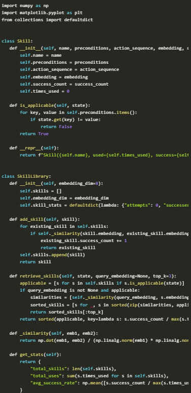 What stands out is how quickly this process becomes effective: even within a small environment and using simple heuristics, the agent begins to show meaningful learning dynamics. Skills are no longer isolated behaviors but internal competencies that improve with experience.