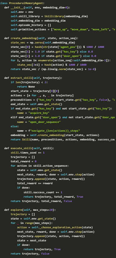 - This setup acts as a testing ground for the procedural memory system, making it possible to track when skills are learned, stored, retrieved, and reused.