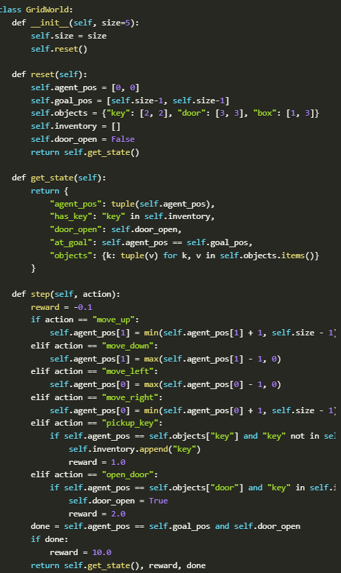 To evaluate procedural memory in a clear and interpretable way, construct a simple, task-driven environment where the agent learns to pick up a key, open a door, and reach a goal. These tasks are intentionally minimal yet structured, allowing us to observe how learning unfolds across episodes.