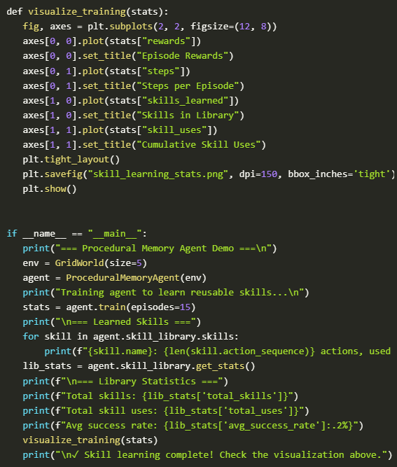 In the final stage, we run the full training loop and observe the procedural memory system in action. Learned skills are printed and inspected, allowing us to see how raw behaviors have been transformed into structured, reusable capabilities.