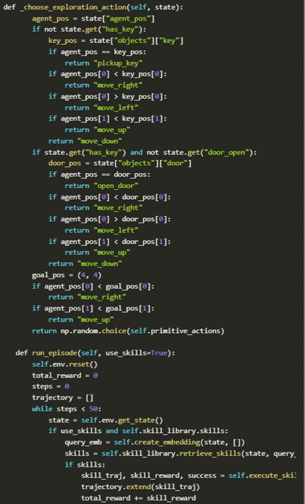 - As training progresses, these primitives naturally evolve into higher-level skills, such as “navigate to key” or “unlock door,” which can be reused across episodes.