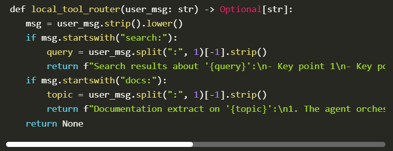 This step involves adding a lightweight tool router to our GPT model, enabling it to perform the task of simulating any of these activities: search or documentation retrieval. The tool router is a feature that identifies special prefixes in user queries, such as search: to find information or docs: to find documentation.