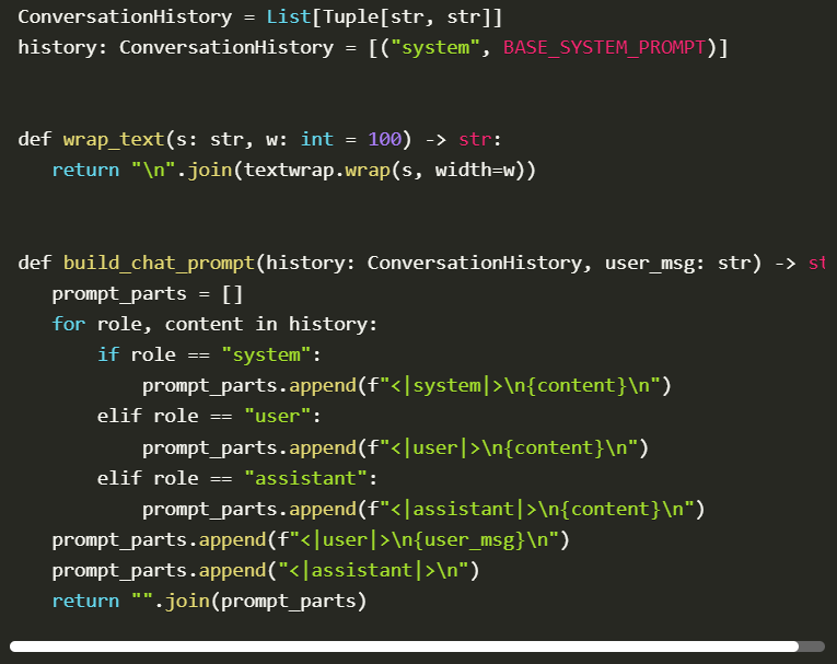 We begin with the conversation history being initialized, followed by a system message that tells the assistant how to behave. Then we design a prompt builder to structure and format all messages in a similar pattern. This framework records both user contributions and the assistant’s contributions, making each conversation turn clear. With this structured flow of dialogue, the model can sense the discussion’s setting, retain past interactions, and provide pertinent and consistent responses. Such an arrangement is necessary to interact meaningfully and easily with the GPT model.