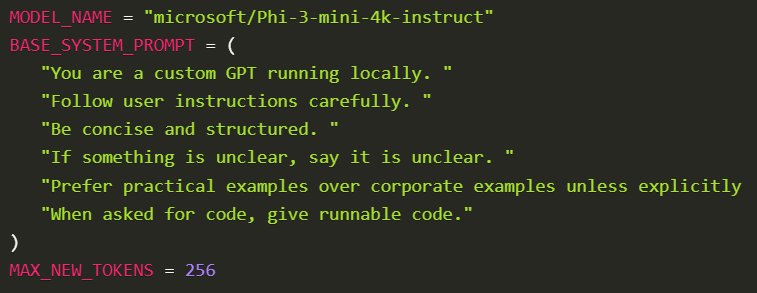 We define the model name here, a system prompt to guide the assistant’s behavior, and token limits. This makes the GPT practical, concise, and clear. By setting these settings, we define the model’s primary identity and instruction style, and influence how it processes instructions, gives examples, and produces runnable code where necessary.