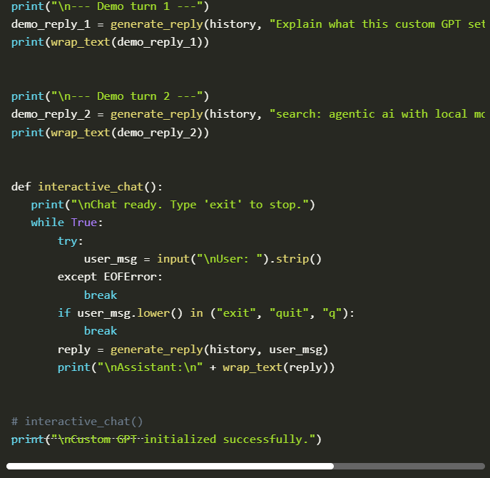 This interactive testing would allow us to see how the model handles various query categories, how it remembers and handles context, and how consistent it is. At the end of this step, we ensure that our custom GPT is operational, entirely local, can intelligently converse, and can be used in practice or further customized.