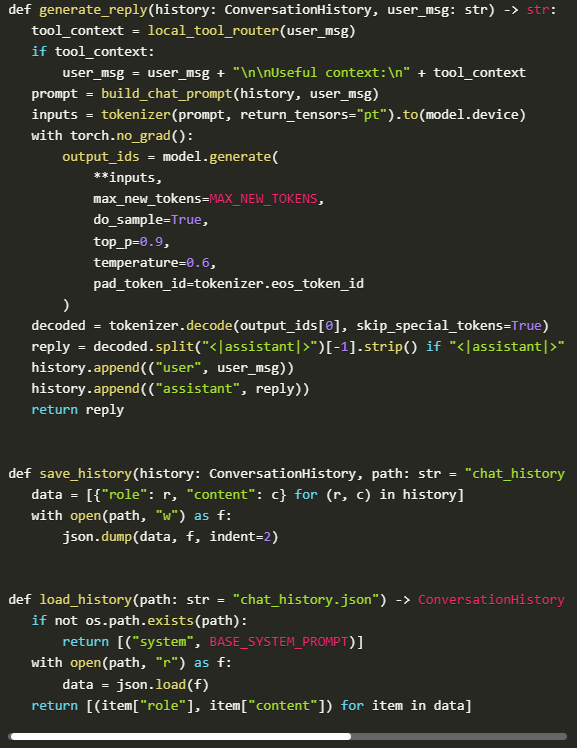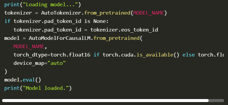 At this stage, we initialise the tokenizer and the Hugging Face GPT model in memory for inference. The code automatically configures device mapping to use a GPU when possible; otherwise, it uses the CPU. It is also necessary to ensure that the tokenizer correctly supports input sequences by inserting a padding token. Once everything is loaded and configured to evaluation mode, the model is ready to respond effectively and consistently.