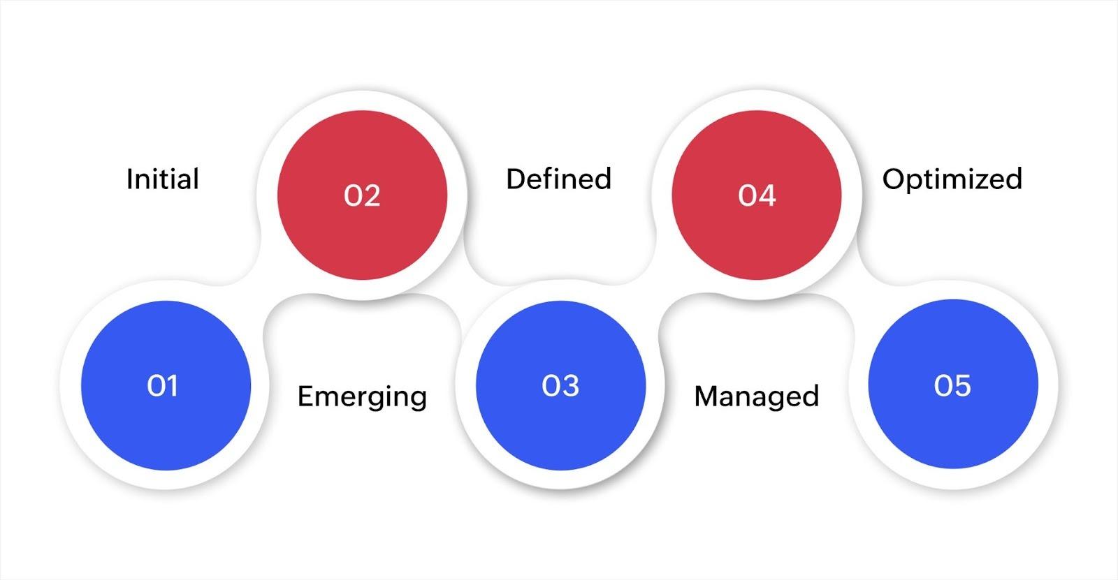 This asks for a breakdown of the typical levels (e.g., initial, developing, defined, optimized) and what each stage looks like in real terms.