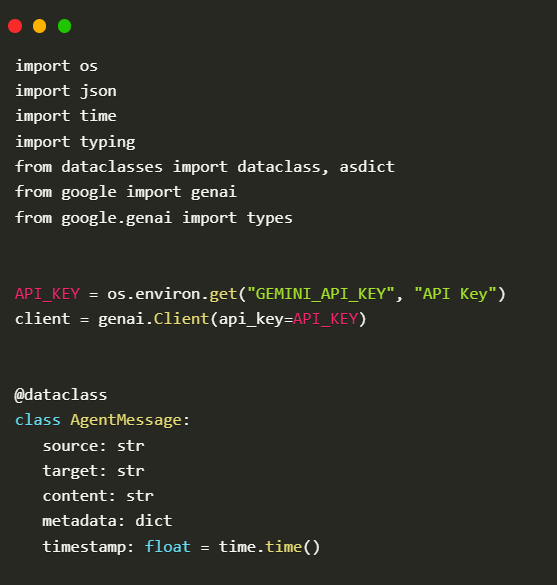 We initialize the Gemini client once so all agents can reuse the same connection instead of creating isolated instances. Next, we define a standardized Agent Message structure, which acts as a shared contract for communication between agents. This structure typically includes fields such as role, intent, payload, and metadata.