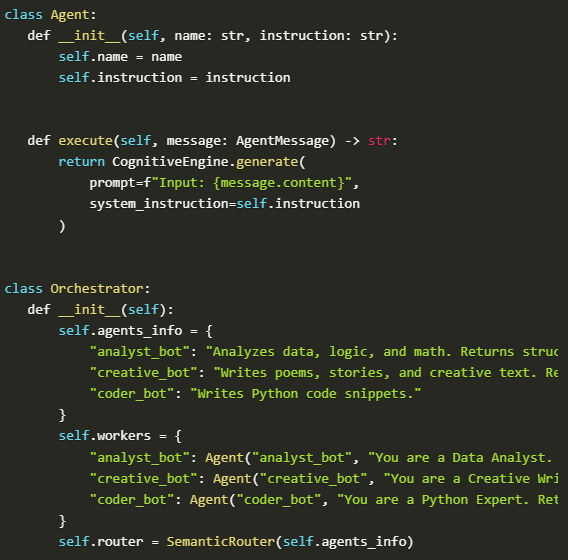 The orchestrator receives tasks from the semantic router, assigns them to the most appropriate agent, tracks progress, and collects responses. By defining roles and orchestration logic upfront, we prepare the system for intelligent task delegation, controlled collaboration, and scalable multi-agent behavior as complexity increases.