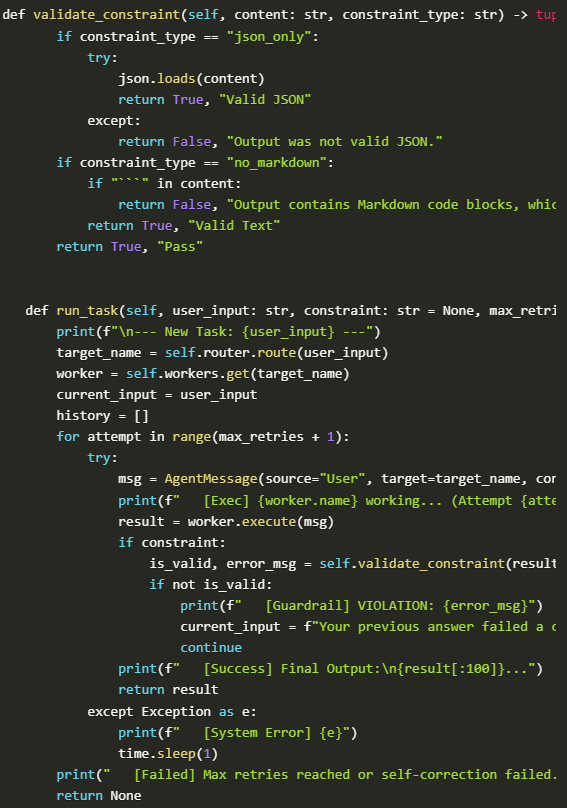 If the response contains extra text or invalid structure, the self-correction loop kicks in until it passes validation. Second, we run a coding task where Markdown is explicitly disallowed. The router assigns the coder agent, then constraint checks confirm the output is plain code-only text without Markdown formatting.