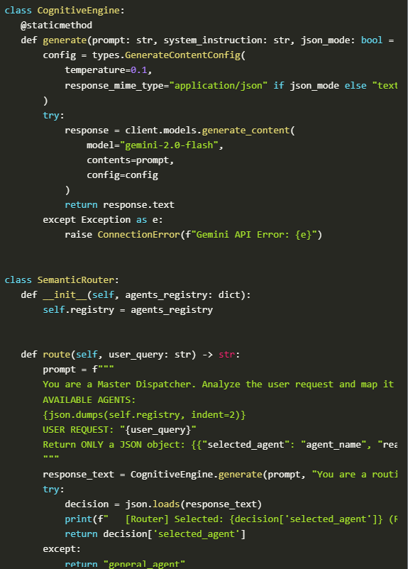 In this step, we construct the cognitive layer powered by Gemini, which serves as the reasoning core of the system. Gemini is configured to generate both free-form text and structured JSON outputs, depending on the instruction and downstream requirements. This flexibility allows agents to switch between conversational reasoning and machine-readable actions.