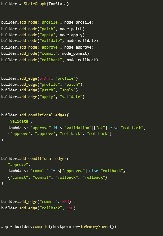 This code is part of an agentic AI system built using LangGraph, with several nodes designed to manage the state of a transaction ledger. The nodes represent distinct stages of transaction processing, including validation, patching, applying patches, and approval. Let’s go through each node and its function: